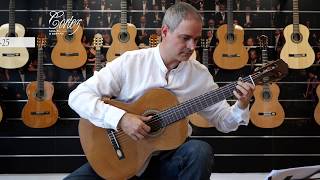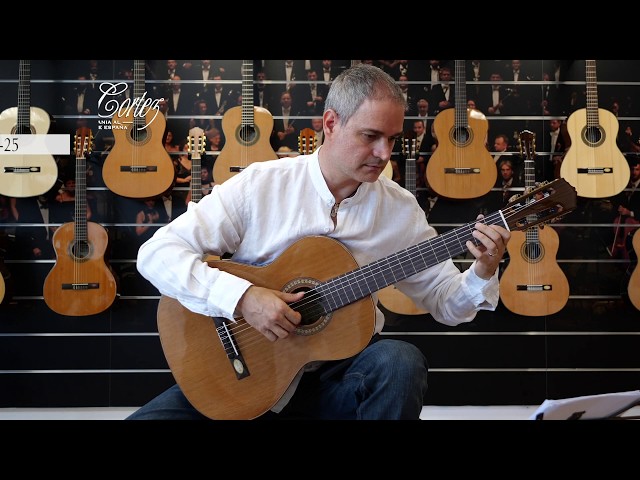 La CC-25 presenta una tavola armonica in cedro massello canadese, fondo e fasce in mutenyé, e un attacco del manico di tipo spagnolo che le conferiscono grande volume e un suono caldo e rotondo.